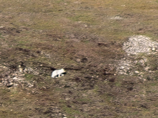 Doch dann zeigte sich in weiter Ferne auf dem Schiff nach Pyramiden ein Polarfuchs. Wir konnten ihn mit Ferngläsern und der Kamera gut sehen, aber wie man sehen kann, hat ein 300mm-Objektiv nicht für vernünftige Fotos gereicht. Auf der Rückfahrt mit dem Bus vom Hafen zur Unterkunft lief dann ein Polarfuchs direkt am Bus den Hang hoch, nur ein paar Meter von unserer Unterkunft entfernt. Bis wir allerdings ausgestiegen waren, war er schon wieder weg. Ich saß am Fenster und konnte ihn daher gut sehen. Natürlich hätte ich auch gerne einen Blick ohne Scheibe dazwischen erhascht und ein schönes Foto gemacht, aber es sollte nicht sein.
