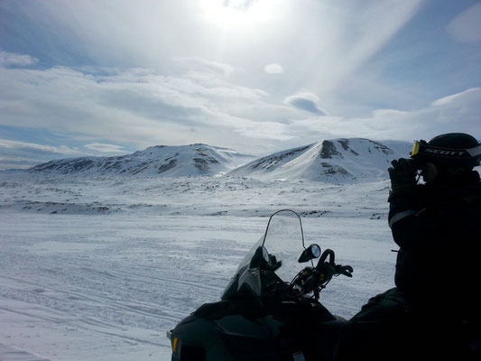 Zum Schutz der Eisbären gibt es auf Spitzbergen einige Regeln. Vom Meer aus müssen 500 Meter Abstand zu den Tieren eingehalten werden. Wer mit dem Schneescooter in ein Eisbären-Gebiet fährt, muss das Schneemobil immer so parken, dass man sofort (also ohne wenden oder ähnliches) losfahren kann. Es ist offiziell verboten, aktiv einen Eisbär aufzusuchen, aber es gibt im Winter Schneemobil-Touren an die Ostküste, wo Eisbären häufiger gesichtet werden. Ein Eisbär hat sich bei meiner Tour zwar nicht gezeigt, aber wir entdeckten Fußspuren und Blutspuren einer frisch getöteten Robbe im Eis.