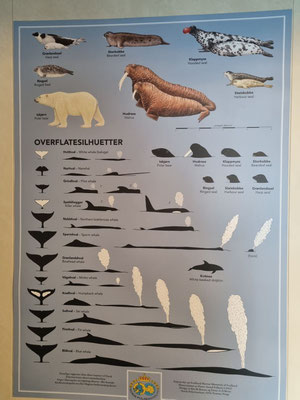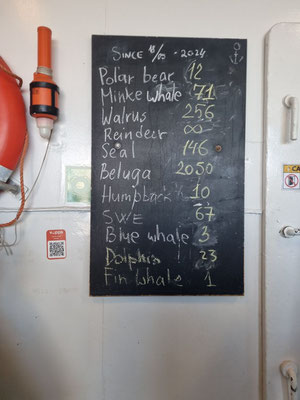 2 Polarfüchse, 3 Walrosse, unendlich viele Spitzbergen-Ren, 1 Robbe, 1 Buckelwal, 1 Zwergwal, ca. 30 Belugas, ca. 8 Weißschnauzendelfine, Dutzende Papageitaucher